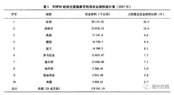 根据欧盟统计局(Eurostat)统计结果,按照2015年欧洲各国可利用农业面积由高到低排序,法国、西班牙、英国、德国、波兰、罗马尼亚、意大利、匈牙利、保加利亚和希腊位于前10位(表1)。其中法国约有可利用农业面积2,900万公顷,占欧盟的16.3%,是欧盟中第一农业大国。欧盟部分成员国最早提出了减少农药使用量,以降低对农业生态环境影响的理念。