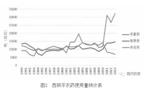 西班牙 农业和农产品加工业是西班牙重要的国民经济部门。其主要种植的农产品是水果和蔬菜,其次是粮食、橄榄油和葡萄。西班牙橄榄种植面积在250万公顷左右,是欧盟和世界主要的橄榄油生产国;西班牙也是世界主要的葡萄种植国,第三大葡萄酒生产国。2010年以前,杀菌剂、杀虫剂和除草剂年平均使用量均在1.0万~1.5万吨左右。近年来杀菌剂用量大幅上升,2013年达3.2万吨,相比2010年增长167%;除草剂用量也有一定幅度增加,2013年约为1.5万吨,相比2010年增长50%;杀虫剂用量有所下降,2013年用量约为0.7万吨,相比2010年(1.4万吨)下降了50%。