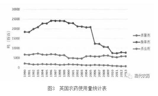 英国 在1990年,英国政府发布了关于农药使用政策的白皮书,追求使用最小化用量来有效防控农业有害生物,并没有设定具体的减量指标。随之发布一系列管理措施,目的是实现长期可持续的农药减量使用。英国使用的农药种类中还是以除草剂为主,2005年以前,除草剂每年使用量均在2.0万~2.5万吨左右,近年来由于使用更高活性、更低用量的除草剂替代产品,除草剂用量大幅下降。2011年至2013 年间,每年除草剂用量仅为7500吨左右。杀菌剂用量年度间变化不大,每年均在5,000~6,000吨左右;杀虫剂用量很少,2000年前后每年用量在1,500吨左右,近年用量持续降低,2011年之后每年用量仅有600~700吨左右。