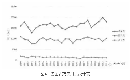 法国 法国是欧盟中最主要的农业大国,农药使用中杀菌剂(含杀细菌剂)用量最大,2002年以前,常年杀菌剂用量折合有效成分(下同)为4万~6万吨左右;2002年之后,杀菌剂用量大幅下降,年使用量在3.5万吨左右,2011年用量仅为2.5万吨,但之后用量又有小幅上升,2013年为3.0万吨;除草剂用量在2000年之前为3万~4万吨/年,随后用量略有下降,2010年降到最低,年用量仅有2.2万吨,近年除草剂用量又有明显上升,年使用量接近3万吨左右;法国杀虫剂用量很少,90年代用量每年在1万吨左右,随后用量大幅下降,2000年之后每年杀虫剂用量仅在2,000~3,000吨左右,但自2011年之后,受当地气候条件的影响,近几年杀虫剂用量又有小幅上升,2013年杀虫剂使用量为3,318吨。