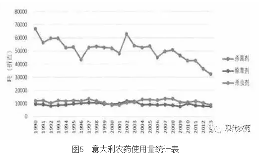 意大利 意大利是欧盟中农业大国,农业总产值仅次于法国和德国,意大利生态农业发达,在柠檬、橙子、葡萄、小麦和蔬菜等种植方面,意大利排名欧洲前列。意大利也是欧洲的农药使用大国,农药使用量仅次于法国,使用的农药以杀菌剂为主,年使用量在5万~6.5万吨左右。在1986年,意大利农业部出台了以有害生物综合治理(IPM)为主的国家行动计划,旨在减少农药使用对农业生态环境的影响。近年来杀菌剂年使用量下降明显,2013年仅有3.2万吨,相比2008年下降了36%。杀虫剂和除草剂使用量年度间变化不明显,杀虫剂年使用量在1万~1.2万吨,除草剂年使用量在0.7万~1万吨左右。