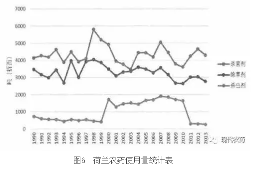 荷兰 荷兰虽然国土面积小,耕地面积只有1 845.75千公顷,但却是一个农业大国,花卉出口世界第一,农业出口额仅次于美国,位居世界第二位。荷兰农业特点是典型的高投入、高产出。农药单位面积使用量也位居欧洲国家前列,远高于法国和德国。自90年代初开始实施农药减量政策,由于大量减少土壤消毒剂的使用,90年代中期相比80年代中期,农药单位面积使用量减少50%。近年来每年使用的杀菌剂4,000吨左右;除草剂的使用量在3,000吨左右;杀虫剂在2000年以前年使用量仅有500吨左右,2000年到2010年10年间使用量大幅上升,每年使用量在1,500~2,000吨左右,但近年来又明显下降,2013年杀虫剂使用量只有266.89吨。荷兰的农药单位面积使用量由5千克/公顷(2008年以前)下降到约4千克/公顷(2013年),虽然下降了20%,但仍然保持在较高水平。