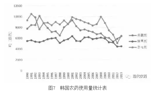 韩国 尽管韩国耕地面积小,但农药单位面积使用量一直居于世界前列。70年代至90年代期间,农药年使用量快速增长,农药单位面积使用量达有效成分13千克/公顷。自1996年开始,韩国的农药管理政策发生重要转变,农药登记转由农村发展部(RDA, Rural Develop¬ment Administration)负责,严格控制农药使用对农业环境的负面影响。自2001年开始,韩国的农药使用量开始下降。杀虫剂年使用量由9,880吨(2001年)降到6,403吨(2013年),下降了35%;杀菌剂年使用量由9,332吨(2001年)下降到6,324吨(2013年),下降32%;除草剂年使用量由6,380吨(2001年)下降到4,479吨(2013年),下降了30%。但韩国目前农药单位面积使用量仍处于较高水平,2013年约为9.6千克有效成分/公顷。