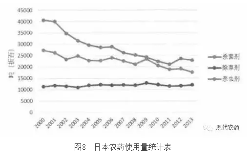 日本 日本是化学工业大国,对农药的管理起步也比较早,自90年代开始农药使用量逐年下降。1999建立了污染物排放与转移登记(PRTR)系统,对于控制农药对农业生态环境的影响也起到了很好的推动作用。近年来,日本农药使用总量持续下降。2000年农药使用量约为8万吨,2013年下降到5.2万吨,下降了35%。从农药使用种类来看,主要是杀菌剂用量大幅下降,年使用量由4万吨(2000年)下降到2.3万吨(2013年),下降了42.5%;杀虫剂用量也在持续下降,年使用量由2.7万吨(2000年)下降到1.7万吨(2013年),下降了37%;除草剂用量变化不大每年使用量均在1.1万吨左右。