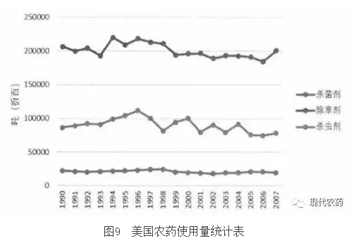 美国 美国是世界上农药使用量最大的国家之一,年使用量在30万吨左右,其中农业用途约占80%。除草剂用量最大,每年使用量在20万吨左右;杀虫剂用量近年略有下降,2000年以前,每年杀虫剂使用量在10万吨左右,近几年,每年杀虫剂用量约在7.5万吨左右;杀菌剂用量相对较少,年度间无明显变化,每年使用量约在2万吨左右。美国主要通过降低农产品中农药残留限量标准,对农药品种开展再评价等手段来减少或限制农药使用带来的风险。自1996至2006年,美国环保署(EPA)通过提高安全标准,取消或限制了270种农药的使用(数据来源:EPA网站)。