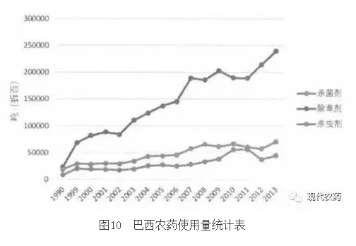 巴西 巴西农业资源丰富,近年来仍处在拓展农业耕地面积阶段,耕地面积每年持续增加。农牧业是巴西重要的支柱产业。从农药使用量来看,自90年代开始,巴西每年农药使用总量快速增长,1990年使用量约为5万吨,2013年达35万吨,相比1990年增长了600%。这主要归因于除草剂用量的快速增长,1990年除草剂用量仅有2.2万吨,2013年除草剂用量达24万吨,大约增长了11倍;杀虫剂和杀菌剂用量也有较大增长,2013年杀虫剂用量约为7万吨,相比2003年3.4万吨增长了1倍,相比1990年1.8万吨增长了4倍多;2013年杀菌剂用量约为4.4万吨,相比2003年1.9万吨增长了130%,相比1990年0.8万吨增长了5.5倍。