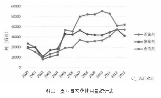 墨西哥 墨西哥是世界主要农业食品出口国之一,是番茄和鳄梨的主产国,番茄产量的90%和鳄梨产量的三分之一用于出口国际市场,是全球第二大青辣椒生产国,第三大草莓生产国。自2007年以来,墨西哥的农药使用量每年稳定在11万吨左右,其中杀菌剂用量最大,且每年使用量均有明显递增。2006年以前杀菌剂年使用量在2万~3万吨,2007—2011年,增长到每年5万~5.5万吨,近年略有下降,年使用量稳定在4万吨左右;除草剂用量近年比较平稳,自2005年以来一直稳定在每年3万-3.5万吨左右;杀虫剂用量呈现持续增长态势,2005年以前每年使用量在1.5万吨左右,2005—2010年增长到每年2万~2.5万吨左右;近年杀虫剂用量持续增加到每年3万~4万吨左右。