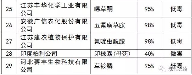 表4-1 拟批准的29个正式登记原药(母药)产品名单