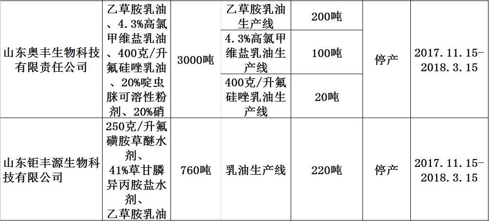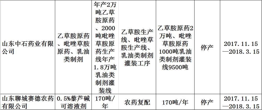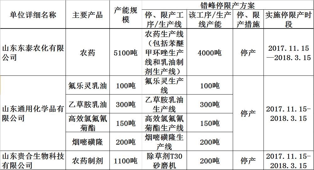 表4-1 聊城市2017-2018年工业企业采暖季实施错峰生产农药企业名单