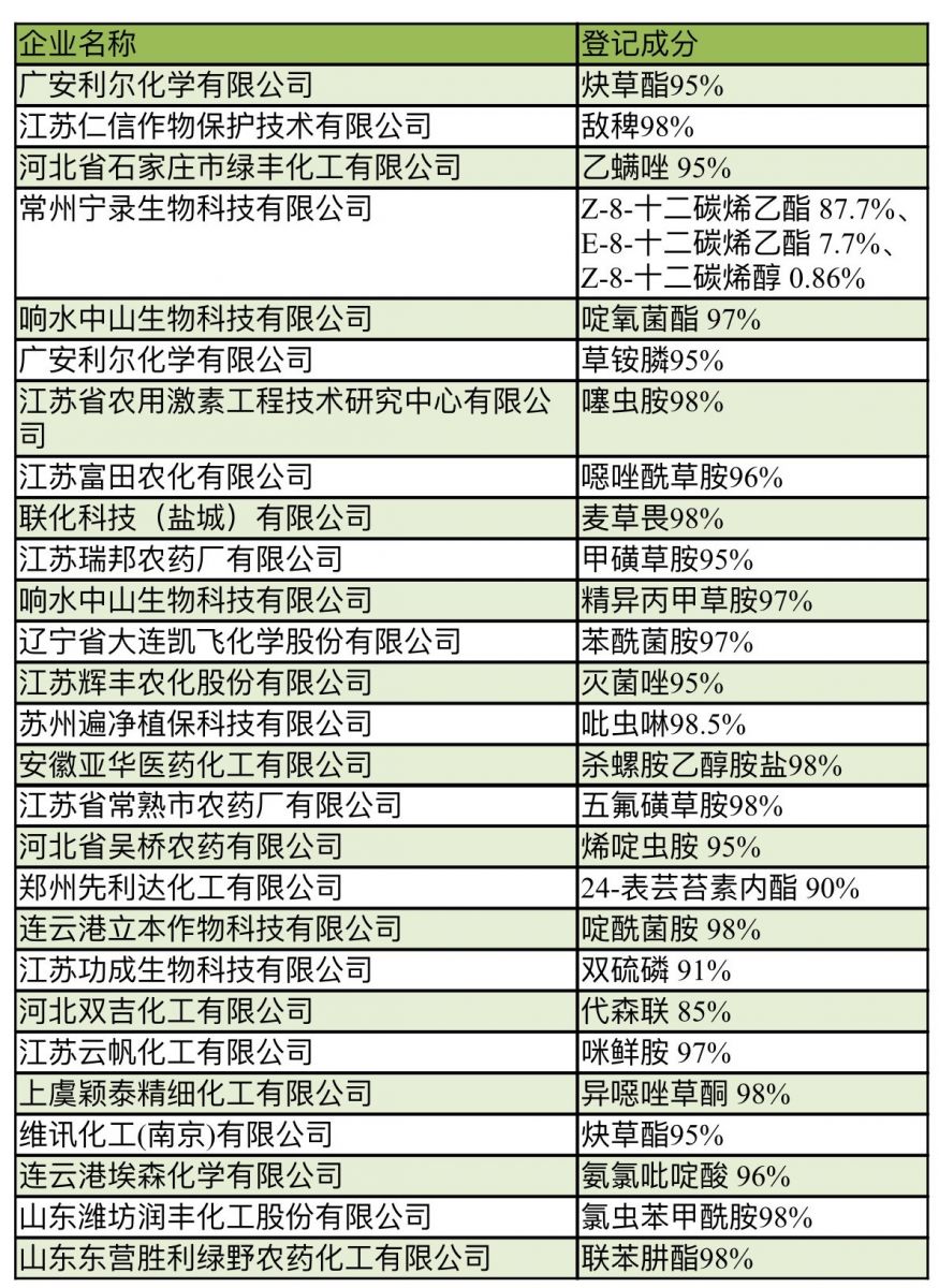 341个正式登记产品包括:南京红太阳股份有限公司25%呋虫胺可湿性粉剂,河南省安阳市锐普农化有限责任公司22.5%啶氧菌酯悬浮剂,陕西康禾立丰生物科技药业有限公司5%高效氯氟氰菊酯水乳剂,六夫丁作物保护有限公司5%阿维菌素可湿性粉剂等。其中,五氟磺草胺相关产品新增17个(原药产品1个,单剂产品12个,复配产品4个);草铵膦相关产品新增18个(原药产品1个,单剂产品14个,复配产品3个);吡唑醚菌酯相关产品新增20个(单剂产品6个,复配产品14个);呋虫胺相关产品新增12个(单剂产品10个,复配产品2个)。本次公示的正式登记产品中有27个是原药。