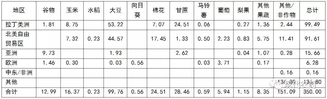 表2-2 2016年丙炔氟草胺的市场分布(按地区/作物分;百万美元)